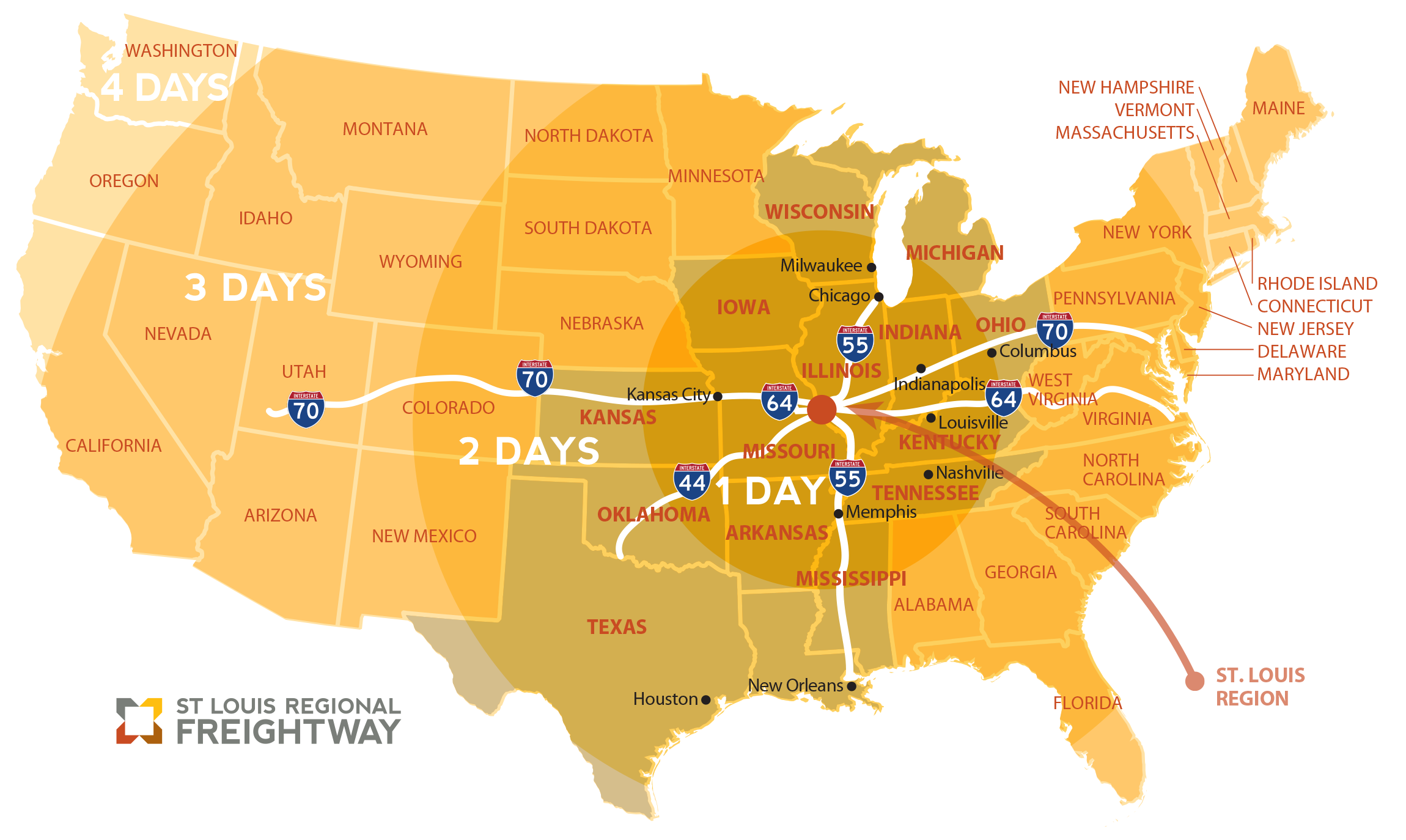 The St. Louis region boasts four interstates and a high-priority corridor that connects the area to key locations in every direction, along with an interstate loop that provides easy travel around the city. This system of interstates also offers fluid connection to and from all of the bistate area’s warehouse and distribution parks and ports on both sides of the Mississippi River. The region’s major interstates reach cities and states across the country, with Chicago, Memphis, Kansas City and Indianapolis within a five hour or less drive time away.